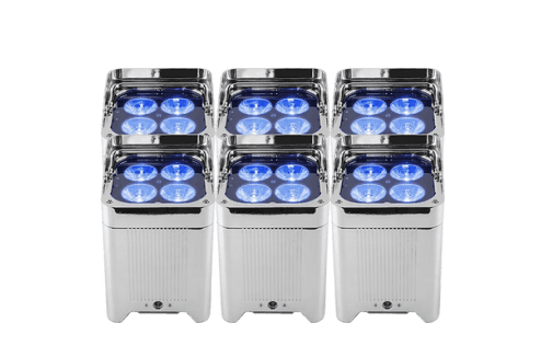 Alimenté par batterie rechargeable certifié IP65. Livré par 6 dans un flight-case.
