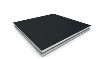 Praticable modulaire scénique Stage82 • Taille du plateau : 1 m x 1 m • Plateau en contreplaqué de bouleau coloris noir épaisseur 15 mm • Charge admissible : 750 kg / m² • Utilisation en intérieur et extérieur